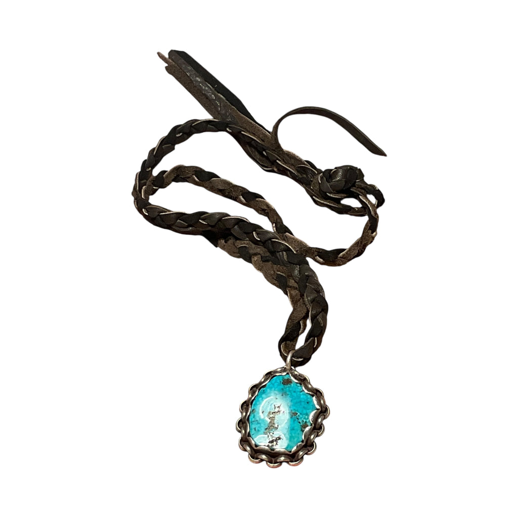 Each piece in our collection tells a story of transformation. This oversized turquoise and sterling silver ring was carefully sourced from an estate collection and reimagined by our artisans, preserving its vintage soul while creating a wearable work of art. The natural turquoise stone is strung on hand-braided leather, blending earthy textures with luxurious silver detailing.