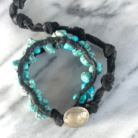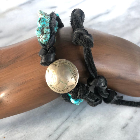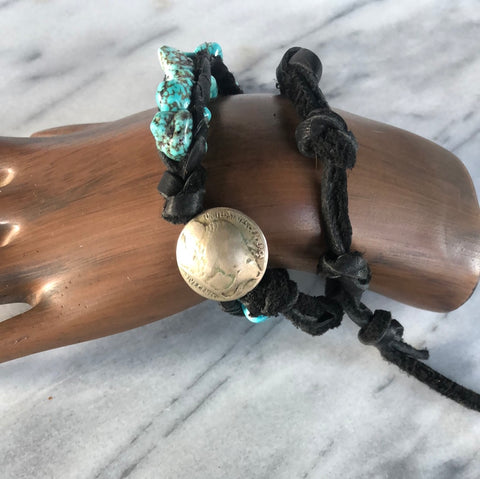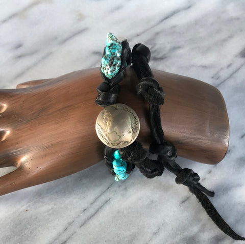 Bison Medicine: Stand into the Storm of life material: New Mexico Turquoise nuggets, hand-cut bison leather. vintage Indian Head coin made into a b...