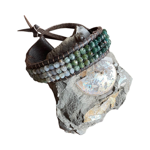 Green Agate Positive Bracelet Leather Handmade Wearable Art by Stormie Jewelry